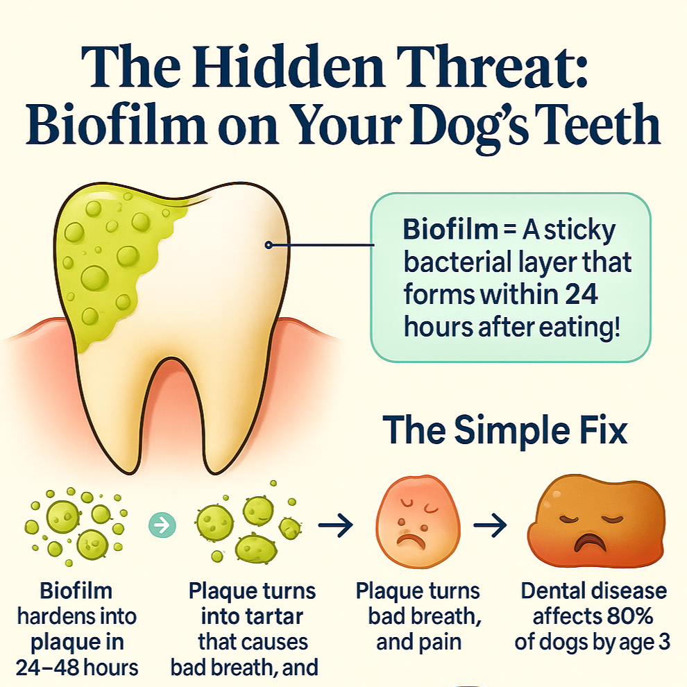 Right now, bacteria are multiplying by the millions in your dog's mouth. That yellow film on their back teeth? It's not aging—it's a bacterial fortress called biofilm, pumping toxins into their bloodstream 24/7.